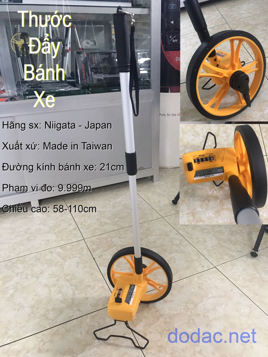 | Thước đẩy bánh xe Truper Hãng sản xuất: Truper Xuất xứ: Made in Taiwan Khoảng cách đo: 9.999 m Đường kính bánh xe: 32cm Bản rộng bánh xe: 2.7cm Chiều cao thước: 1m Trọng lượng: 1.8 kg Dạng đọc kết quả đồng hồ: Nhảy số Có thể trả về 0 Chất liệu: Nhôm - nhựa cao cấp | Thước đẩy bánh xe Niigata RM-8 Hãng sản xuất: Niigata Seiki - Japan Xuất xứ: Made in Taiwan Khoảng cách đo: 9.999 m Đường kính bánh xe: 21 cm Bản rộng bánh xe: 2.2 cm Chiều cao thước: 58 - 110 cm Trọng lượng: 750 g Dạng đọc kết quả đồng hồ: Nhảy số Có thể trả về 0 Chất liệu: Nhôm - nhựa cao cấp |