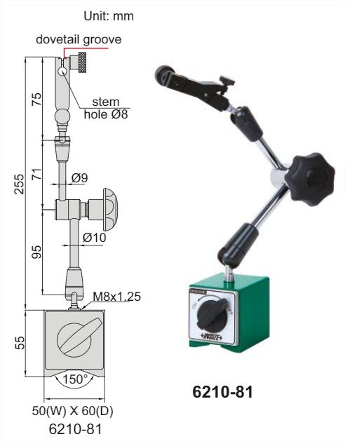 Đường kính lỗ dùng cho đồng hồ so: Φ4mm, Φ8mm, Φ9.53mm (3/8'')