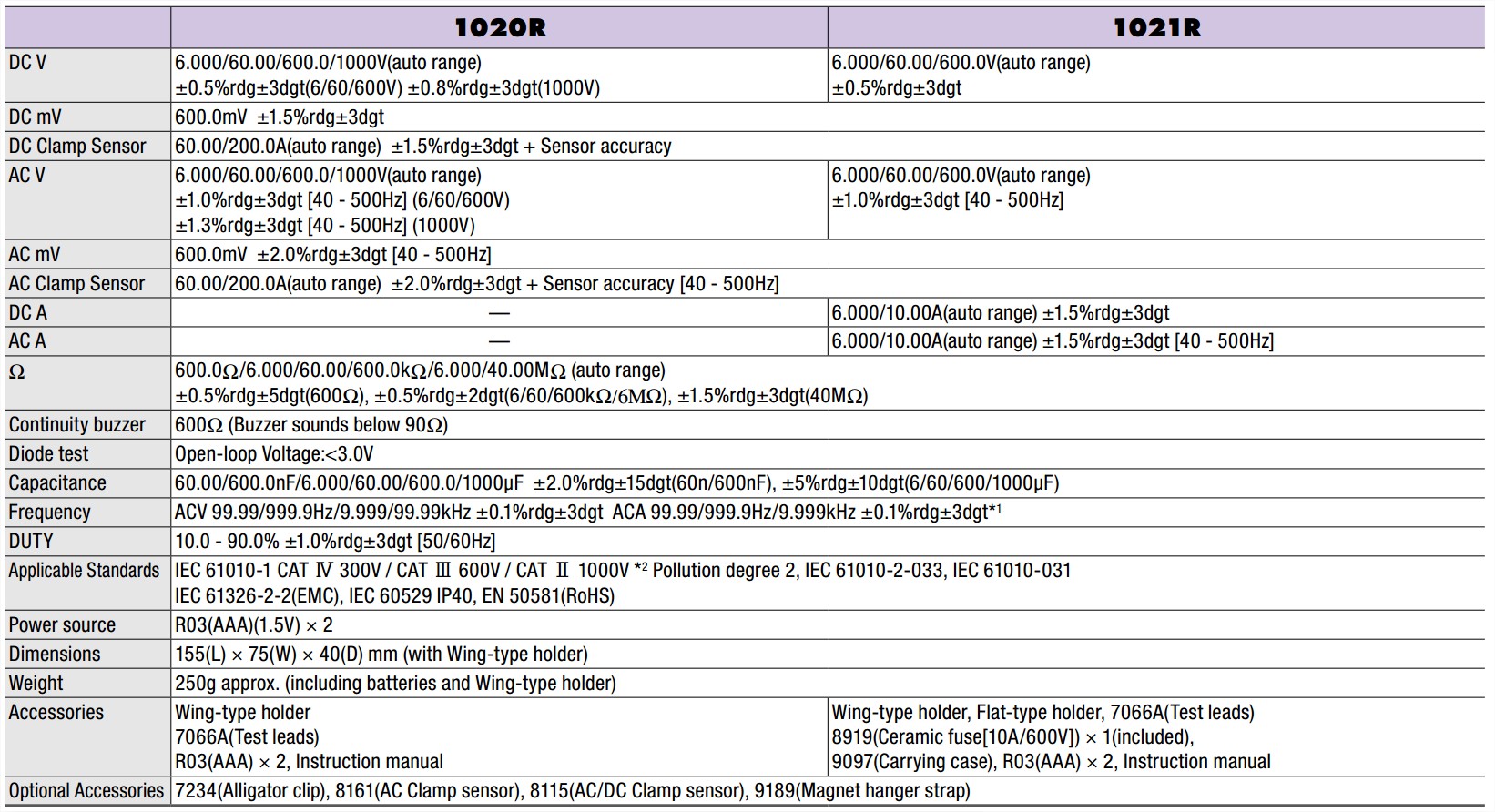 * AC V: 6V/60V/600V/1000V (1020R) - Auto range