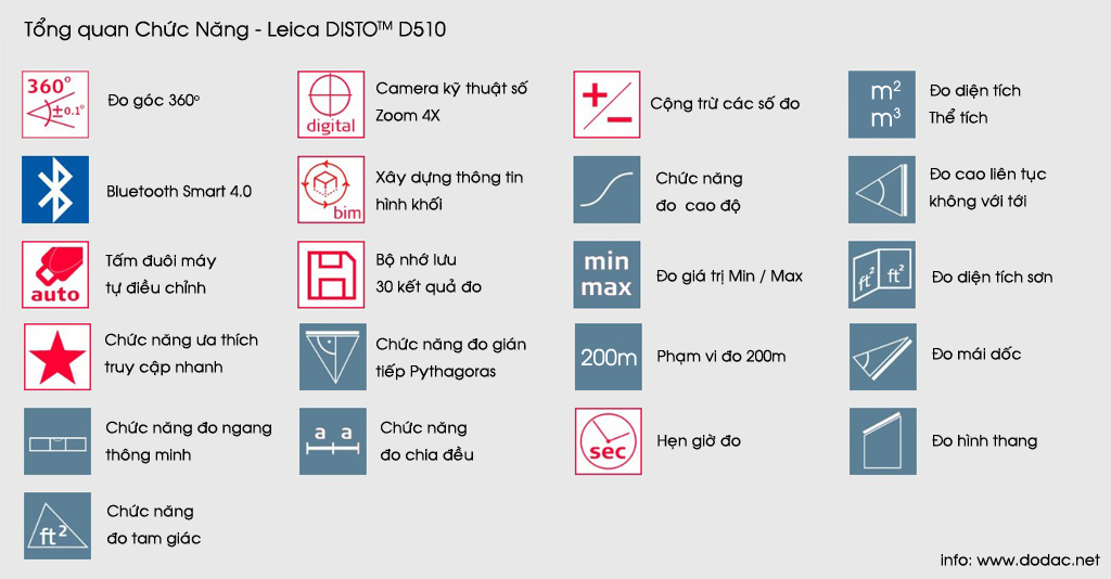 Tùy chọn: Quý khách có thể mua Trọn bộ Leica DISTO D510 Package với chi phí tiết kiệm hơn 2,5 triệu đồng. Bao gồm: 01 Máy Leica DISTO D510 01 Chân máy Leica Tri 70 01 Bộ vi động tinh chỉnh FTA360 01 Case - Thùng đựng máy